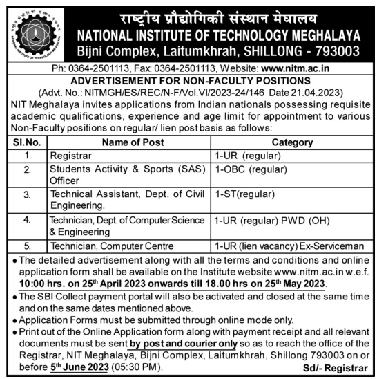 Non-Teaching Faculty Recruitment 2023 notification announced by the National Institute Of Technology, Meghalaya – Registrar, Students Activity & Sports Officer, Technical Assistant, Technician Jobs. Eligible candidates may apply online and send hard copy by post/courier by 5th June 2023.