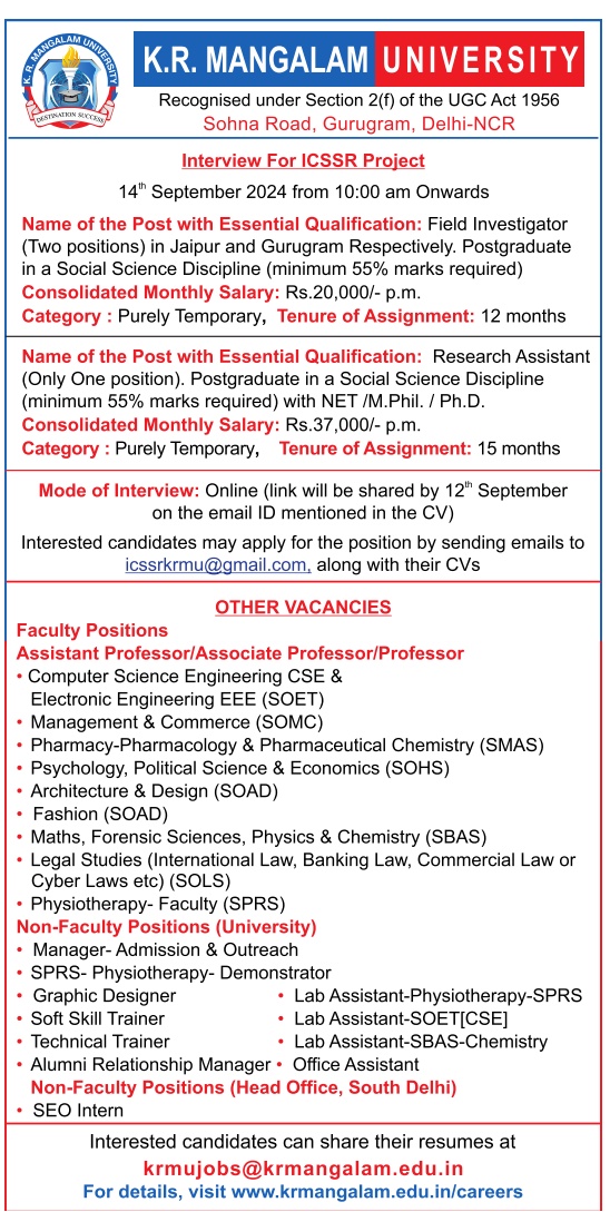 - Interested candidates can share their resumes at [email protected] For details, visit www.krmangalam.edu.in/careers