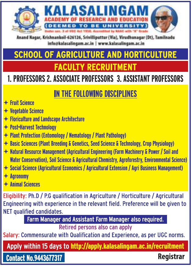 Kalasalingam Academy of Research and Education (Deemed to University)- Faculty Recruitment 2021