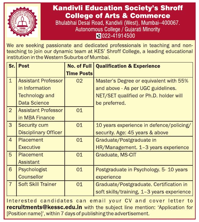 Hiring Organization: Kandivli Education Society’s Shroff College of Arts & Commerce, Mumbai