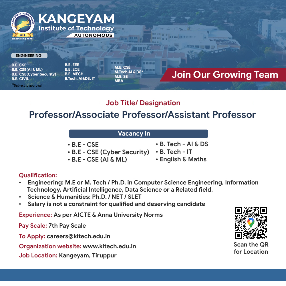 Faculty Recruitment 2026 job notification announced by Kangeyam Institute of Technology, Kangeyam, for the academic year 2026 – 27. Eligible candidates may apply through Email.