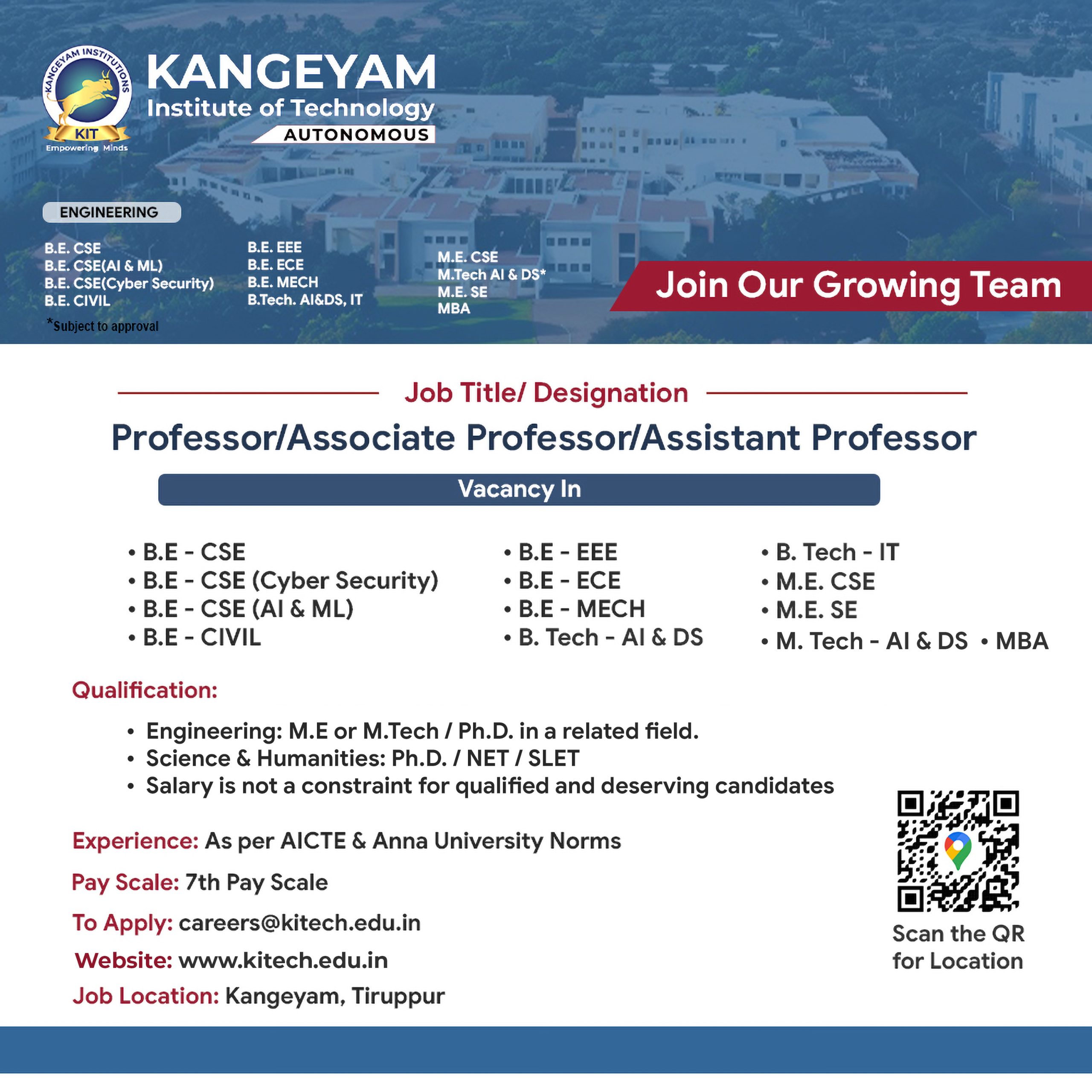 Innovative academic career opportunities are now open at Kangeyam Institute of Technology, Tiruppur – rewarding faculty openings in Civil, CSE, Cyber Security, AI & ML, ECE, EEE, Mechanical, AI & DS, IT, English, and Mathematics. The institution invites applications for Professor, Associate Professor, and Assistant Professor positions. Qualified candidates with strong academic credentials and passion for teaching are encouraged to apply through email on or before 30 April 2026.