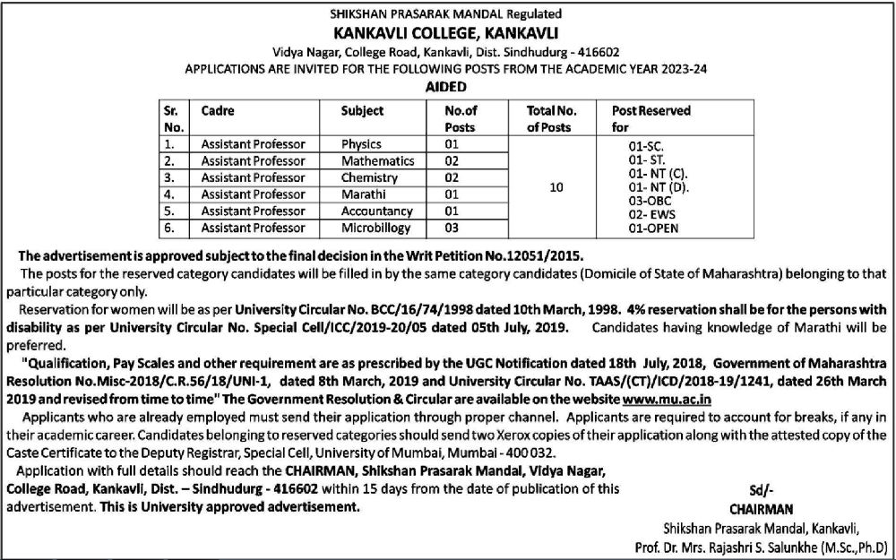 Faculty Recruitment 2023 Job vacancy notification announced by Kankavli College, Kankavli for the 2023-2024 academic year. Eligible candidates may apply within 15 days from the date of advertisement through Postal.