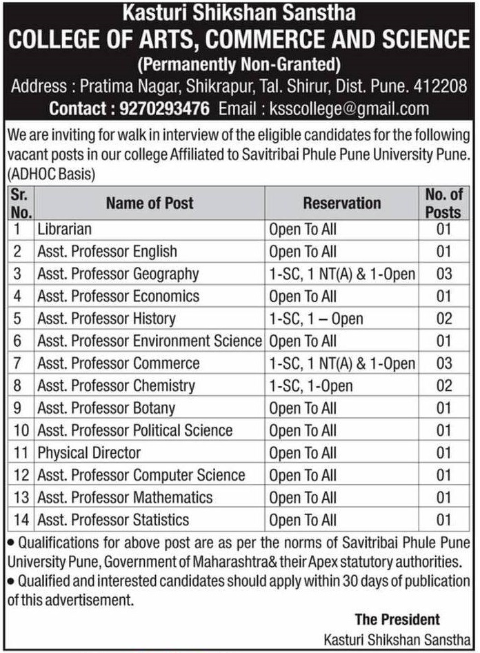 Faculty Recruitment 2025 job notification announced by Kasturi Shikshan Sanstha, College of Arts, Commerce and Science, Pune for 2025-2026 academic year. Eligible candidates may apply through Postal