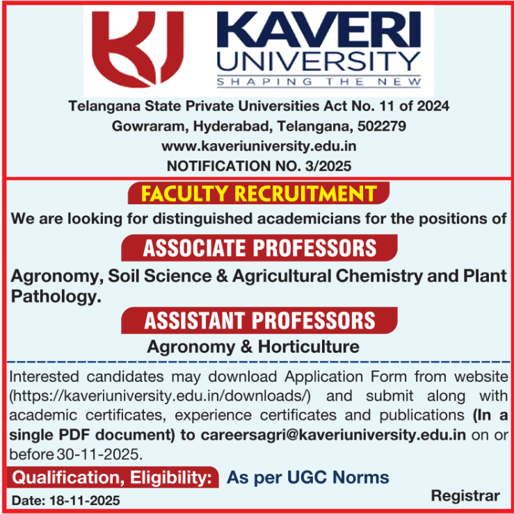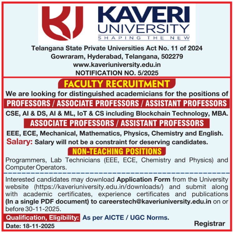 How to Apply: Interested candidates may download Application Form from the University website (https://kaveriuniversity.edu.in/downloads/) and submit along with academic certificates, experience certificates and publications(In a single PDF document) to [email protected] on or before 30-­11-2025.