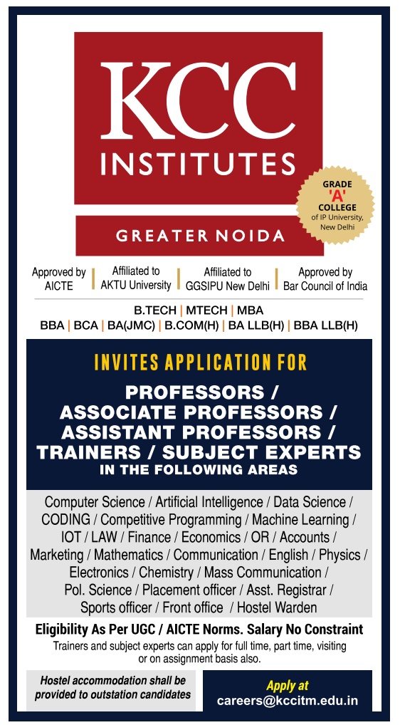 Faculty Recruitment job notification announced by KCC Institutes, Greater Noida, Uttar Pradesh for the post of Professor, Associate Professor, and Assistant Professor/ Trainers/ Subject Experts Jobs. Eligible candidates may apply by email.