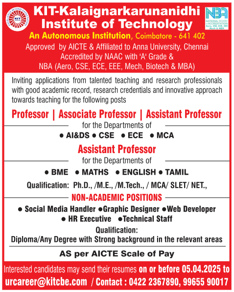 Faculty recruitment notification announced by Kalaignarkarunanidhi Institute of Technology, Coimbatore, Tamilnadu for the 2025-2026 academic calendar year. Eligible candidates may apply through Email