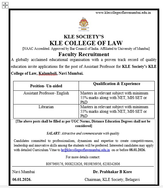 Faculty Recruitment for Assistant Professor of English and Librarian at KLE College of Law, Navi Mumbai [Attractive Salary]: Apply by Jan 8, 2026