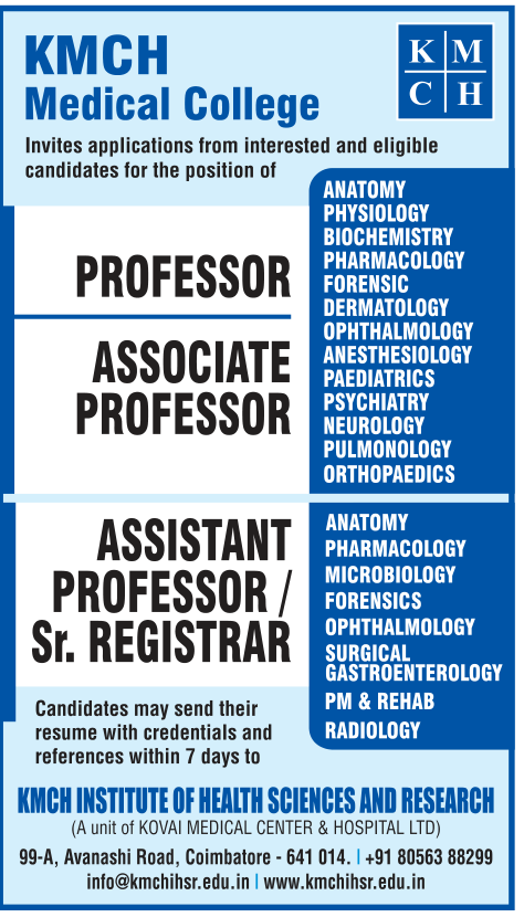 - KMCH Medical College: Professor/ Associate Professor/ Assistant Professor/ Senior Registrar