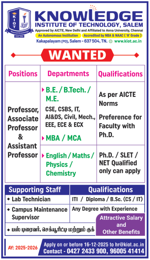 Knowledge Institute of Technology, Salem, Tamilnadu announced faculty recruitment 2025 notification for the post of Assistant Professor/Associate Professor/Professor . Eligible candidates may apply through Email.