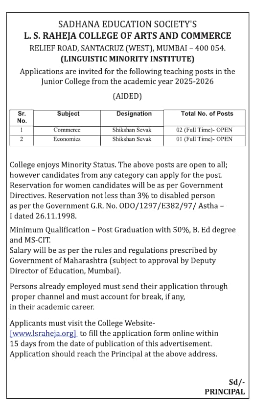 Faculty recruitment 2025 Job vacancy notification announced by the L. S. Raheja College Of Arts & Commerce – Teaching Faculty Jobs for 2025-2026 academic year. Eligible candidates may apply within 15 days from the date of advertisement.