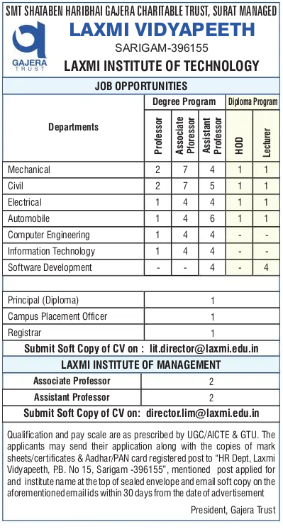 Faculty Recruitment job notification announced by Laxmi Institute of Technology, Gujarat for the Post of HOD/ Professor/Associate Professor/Assistant Professor/ Lecturer . Eligible candidates may apply through Email and Postal