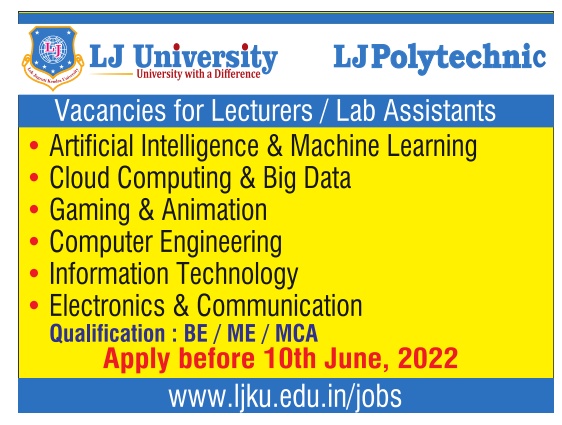 Faculty Recruitment job notification announced by LJ Polytechnic university, Ahmedabad, Gujarat for the post of Lecturers, Lab Assistant Jobs. Eligible candidates may apply by Online.