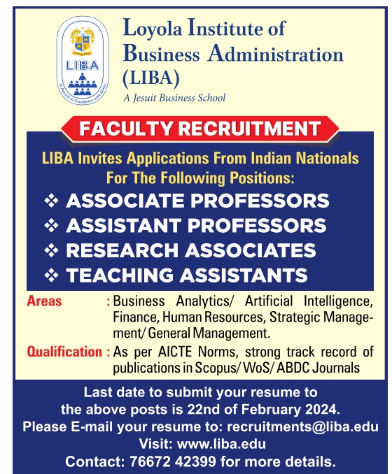 Faculty recruitment 2024 notification announced by Loyola Institute of Business Administration, Chennai Wanted Teaching Faculty for the 2024 academic calendar year. Eligible candidates may apply through Email.