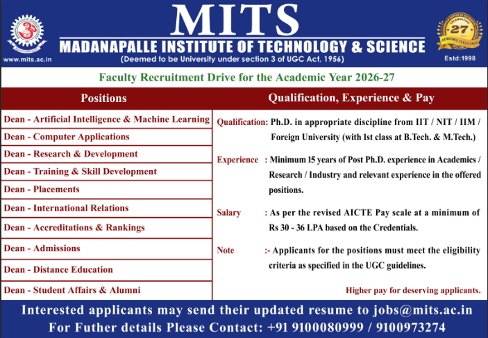 Salary : As per the revised AICTE Pay scale at a minimum of Rs 30 – 36 LPA based on the Credentials.