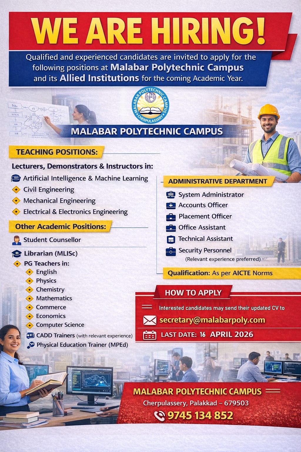 Malabar Polytechnic Campus, Palakkad has announced faculty and administrative recruitment for the academic year 2026. Applications are invited for Lecturer, Demonstrator, and Instructor positions in core engineering disciplines such as Artificial Intelligence & Machine Learning, Civil, Mechanical, and Electrical & Electronics Engineering. The institution is also hiring PG Teachers, Librarian, Student Counsellor, and various administrative staff. Candidates with relevant qualifications and experience are encouraged to apply. This is an excellent opportunity to work in a growing polytechnic institution that focuses on technical education, skill development, and student career growth.