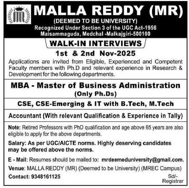 Malla Reddy (MR) Deemed to be University, Telangana Advertised for the Faculty Recruitment 2025 .Eligible candidates may appear for Walk-in Interview. For More Details see below.