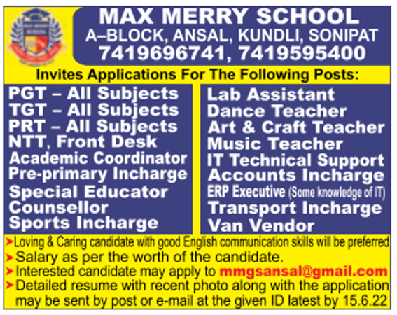 Teaching and Non-Teaching Faculty Recruitment job notification announced by Max Merry School, Sonipat for the post of PGT/TGT/PRT/NTT Teacher, Special Education Teacher, Front Desk Executive, Academic coordinator, Pre-Primary InCharge, Counsellor, Sports InCharge, Lab Assistant, Dance Teacher, Art & Craft Teacher, Music Teacher, IT Technical Support, Accounts InCharge, Transport InCharge, Van Vendor jobs. Interested candidates may apply by email/post.
