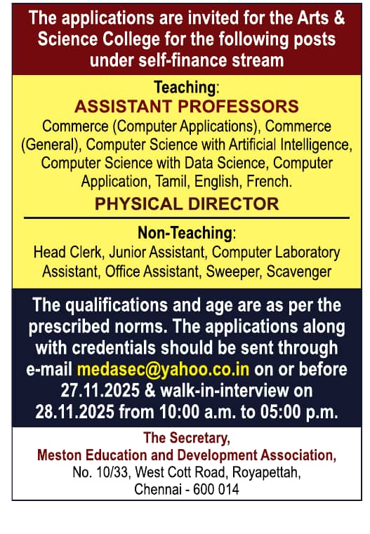Faculty recruitment 2025 Job vacancy notification announced by the Meston Education and Development Association, Chennai – Assistant Professor Jobs for the 2025-2026 academic year. Eligible candidates may apply by email and Walk-In