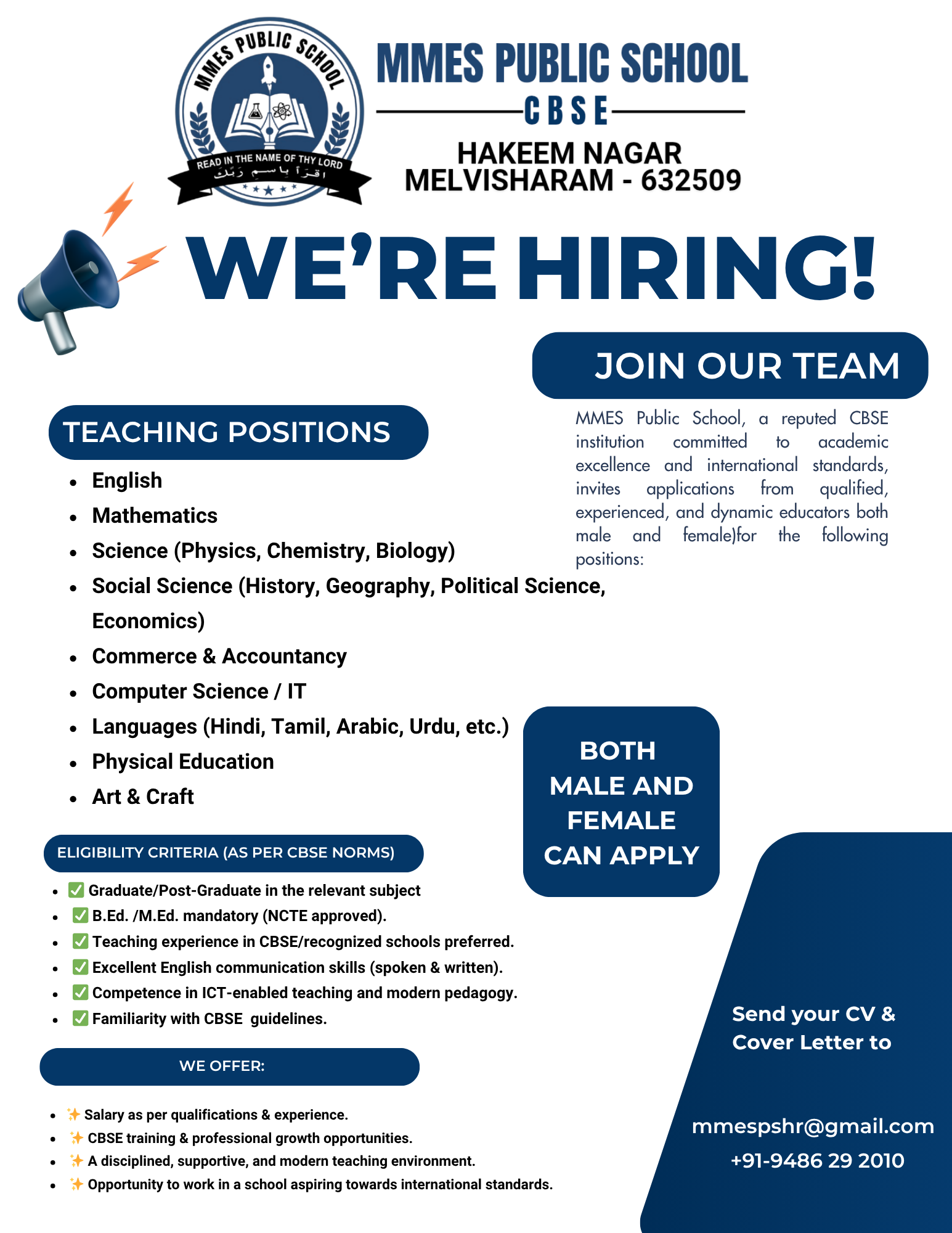 Faculty Recruitment 2025 job notification announced by MMES Public School (CBSE), Melvisharam, Ranipet, Tamil Nadu for 2025-2026 academic year. Eligible candidates may apply through Email.