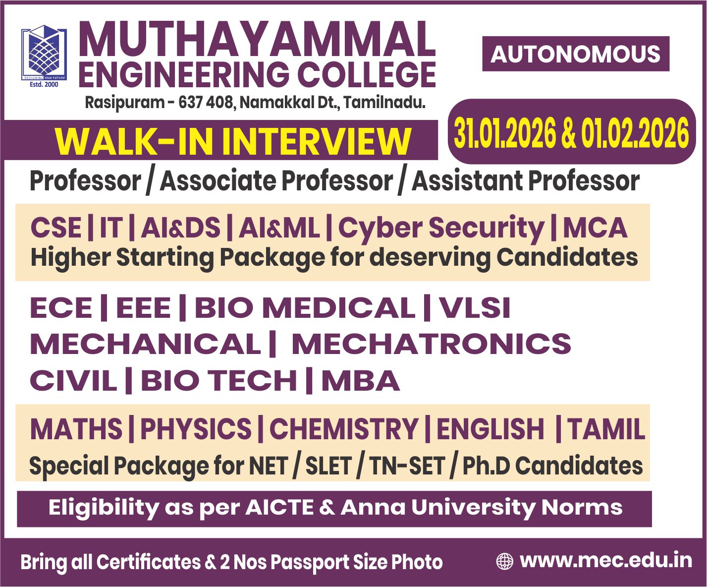 Muthayammal Engineering College (Autonomous), Namakkal | Walk-in on 31-01-2026 (Saturday) & 01-02-2026 (Sunday)