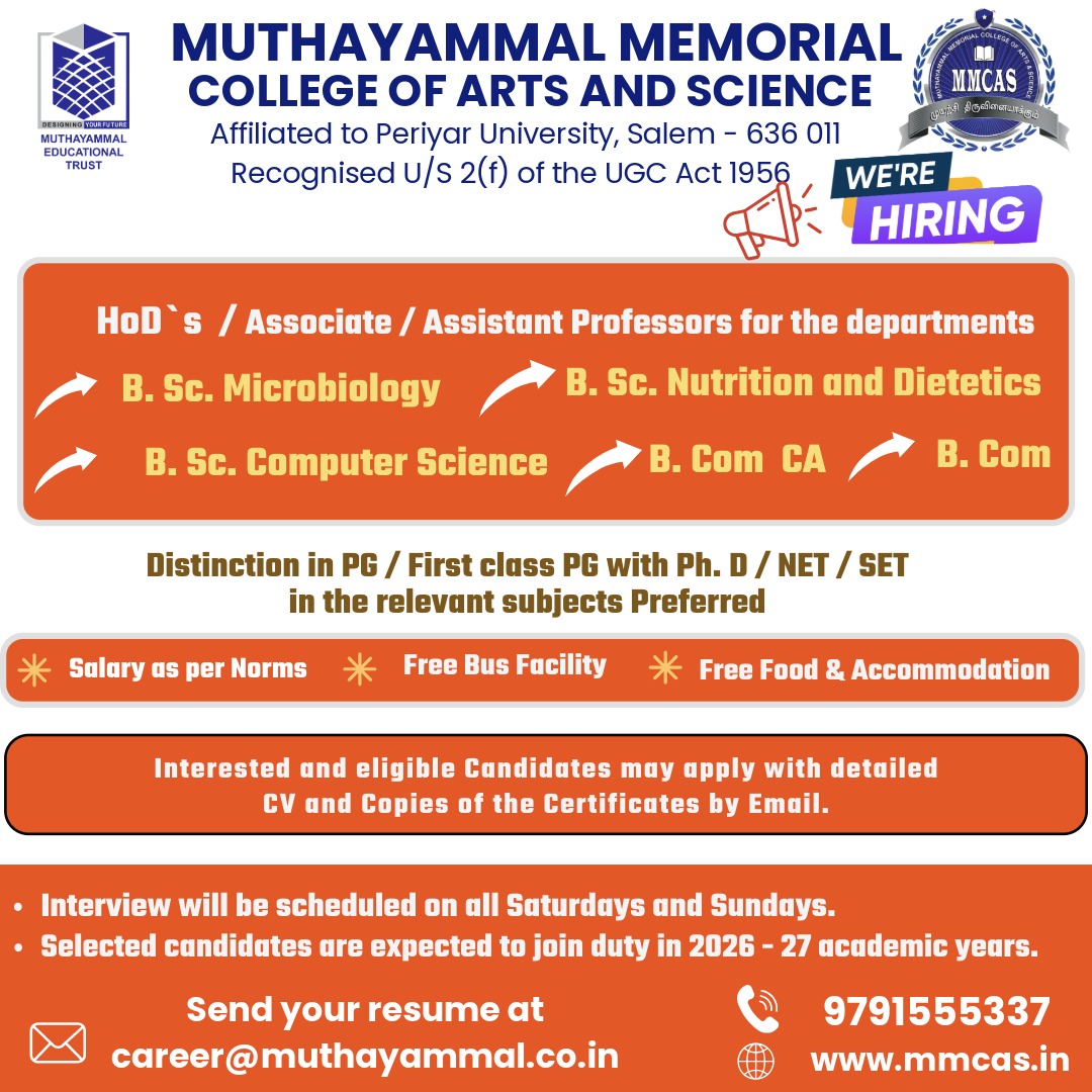 HoD’s, Associate & Assistant Professors 2026 Job notification announced by Muthayammal Memorial College of Arts & Science, Rasipuram, Tamil Nadu for 2026-2027 academic year. Eligible candidates may apply through Email.