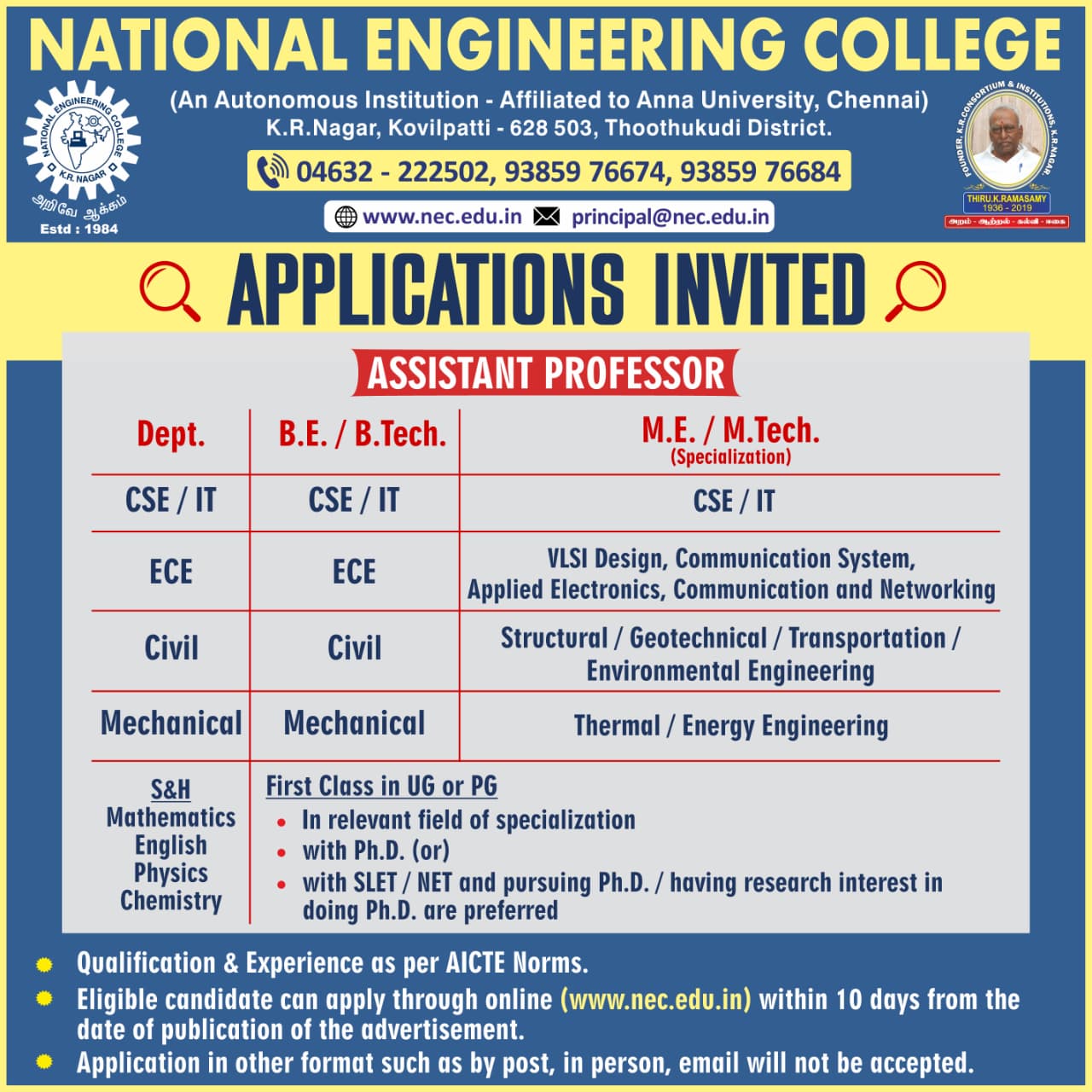 National Engineering College, Kovilpatti, Thoothukudi- Faculty Recruitment 2026