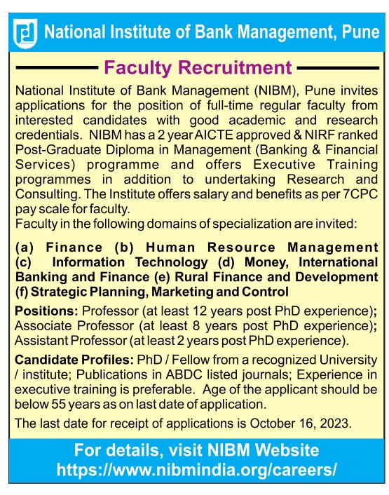 Teaching Faculty Recruitment job notification announced by National Institute of Bank Management, Pune for the post of Professor/ Associate Professor/ Assistant Professor jobs. Interested candidates may apply online.