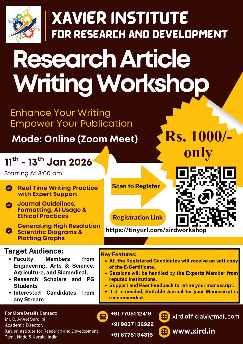 XIRD is going to organize three days National Level Workshop on “Research Article Writing.” It aims to enhance academicians and researchers writing and their publications. It provides Real Time Writing Practice with Expert Support, Journal Guidelines, Formatting, AI Usage & Ethical Practices, Generating High Resolution Scientific Diagrams & Plotting Graphs.