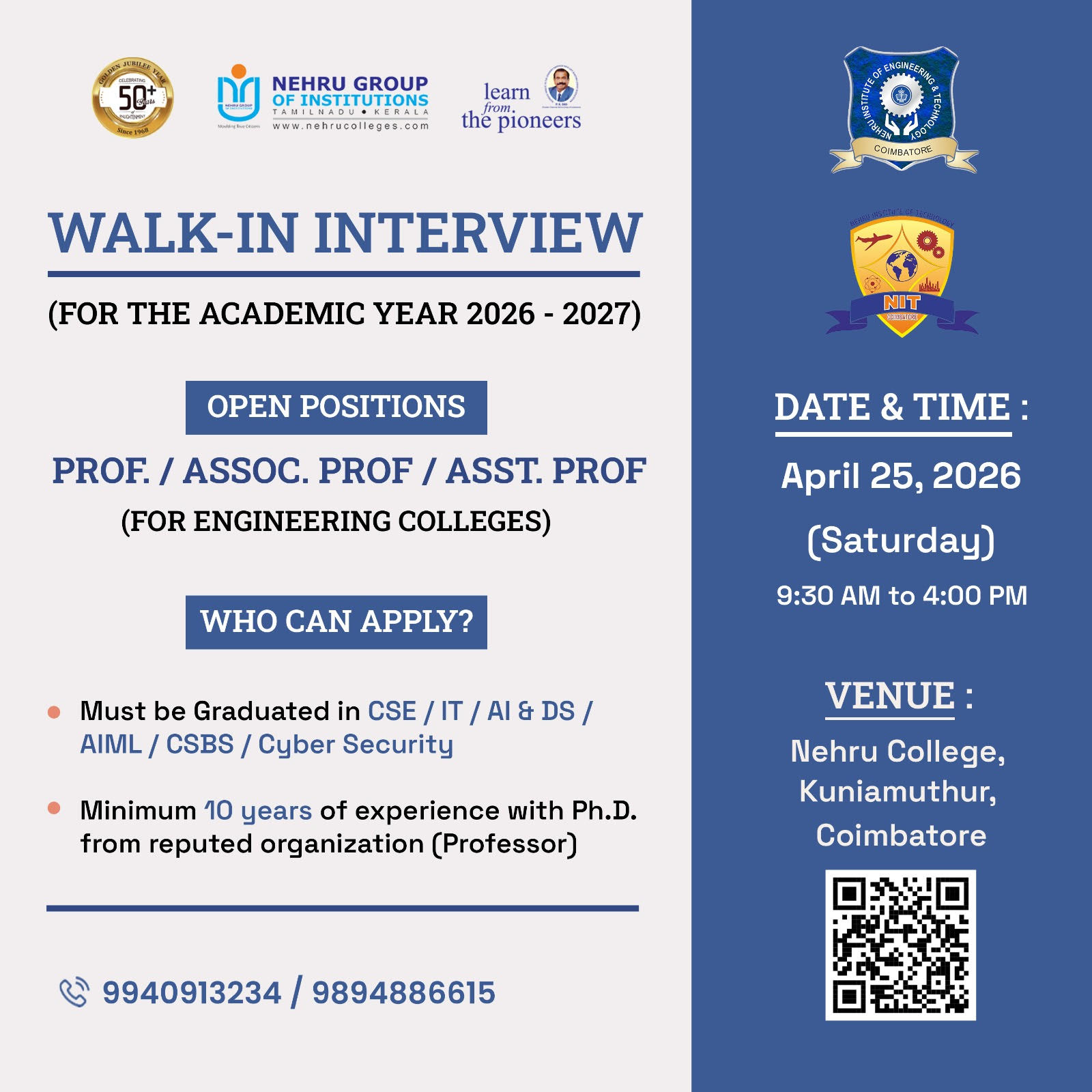 Nehru Group of Institutions invites applications from qualified and enthusiastic academicians for teaching positions in its engineering institutions located in Tamil Nadu and Kerala. The openings are available for Professor, Associate Professor, and Assistant Professor roles . Candidates with a strong academic foundation and a passion for teaching and research are encouraged to apply. This opportunity offers a competitive salary package and a platform to contribute to a dynamic and innovation-driven academic environment.