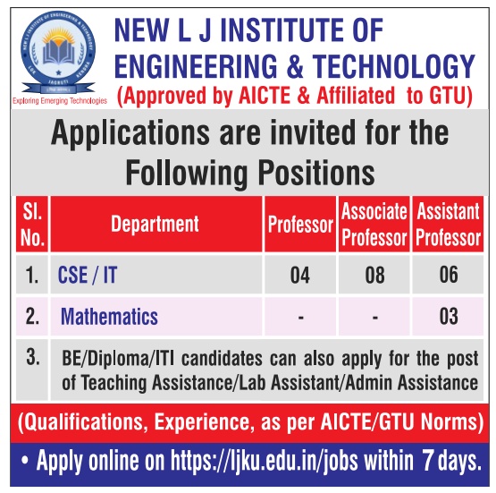 New L J Institute of Engineering & Technology, Ahmedabad Wanted Professor/ Associate Professor/ Assistant Professor for 2022 academic year. Eligible candidates may apply Online within 7 days