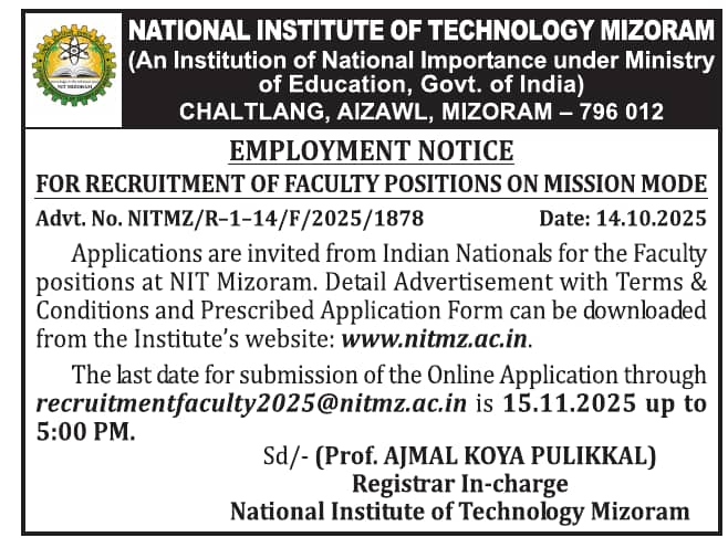 National Institute of Technology Mizoram invites applications from Indian Nationals possessing excellent academic background for recruitment of the following Faculty positions: