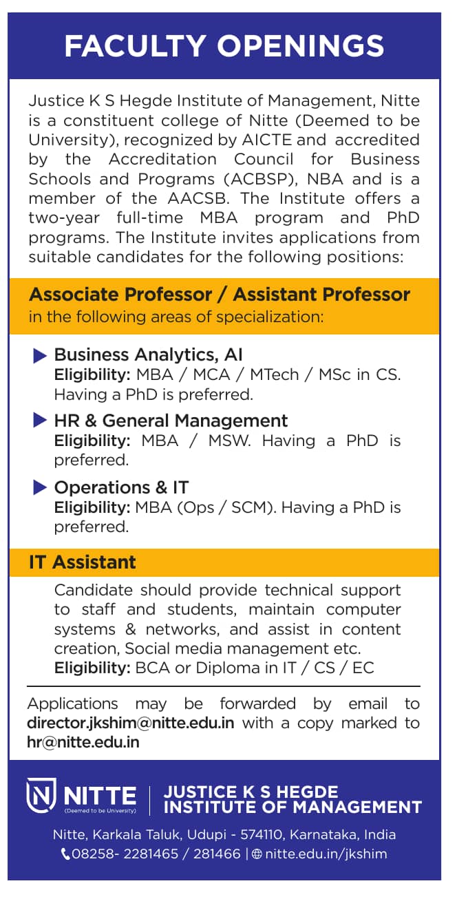 Faculty recruitment 2025 Job vacancy notification announced by NITTE, Justice K S Hegde Institute of Management, Udupi – Associate Professor/ Assistant Professor Jobs for the 2025 academic year. Eligible candidates may apply by email