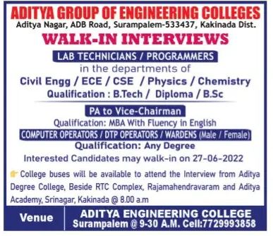 Teaching Faculty Recruitment job notification announced by Aditya Group of Engineering Colleges, Kakinada , Andhra Pradesh for the post of Lab Technicians, PA to Vice Chairman, Computer Operator, Wardens jobs. Interested candidates may appear for walk-in interview.