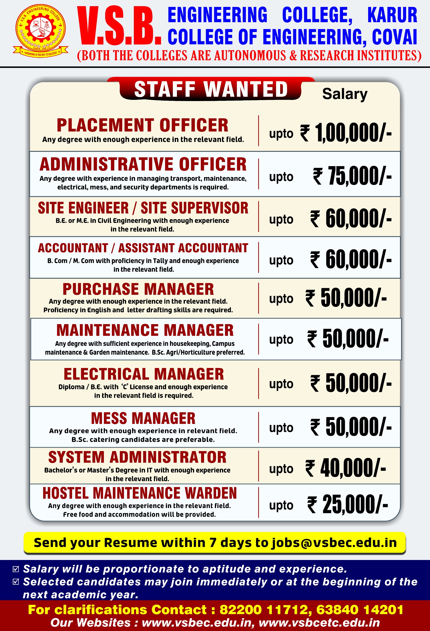 VSB Group of Institutions, located in Karur and Coimbatore, has announced recruitment for non-academic positions for the academic year 2026. Applications are invited for the positions of Placement Officer, Administrative Officer, Engineer, Manager, and various support roles. The institutions are seeking experienced professionals with strong administrative and technical skills. This is a valuable opportunity for candidates looking for non-teaching jobs in engineering colleges in Tamil Nadu. Interested applicants should apply through email within 7 days from 28 April 2026.