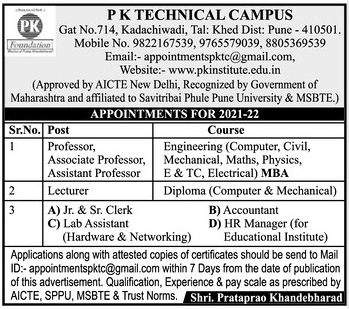Teaching Jobs vacancy notification announced by P K Technical Campus, Pune for 2021-2022 academic calendar year for Professor/ Associate Professor and Assistant Professor Jobs. Eligible candidate may apply within 7 days through Email.