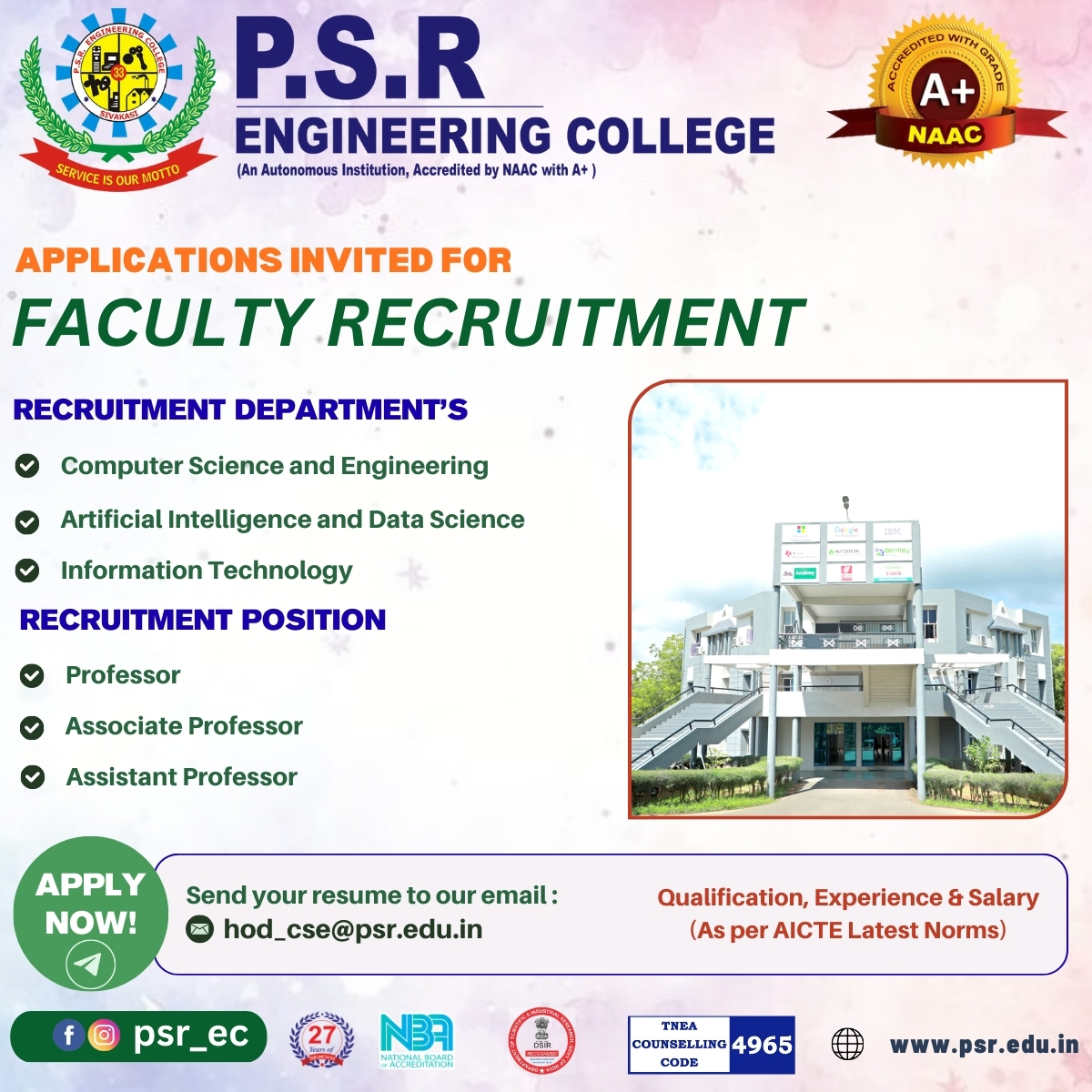 Faculty Recruitment 2025 job notification announced by P.S.R College Engineering College, Sivakasi, Tamilnadu for 2025-2026 academic year. Eligible candidates may apply through Email.