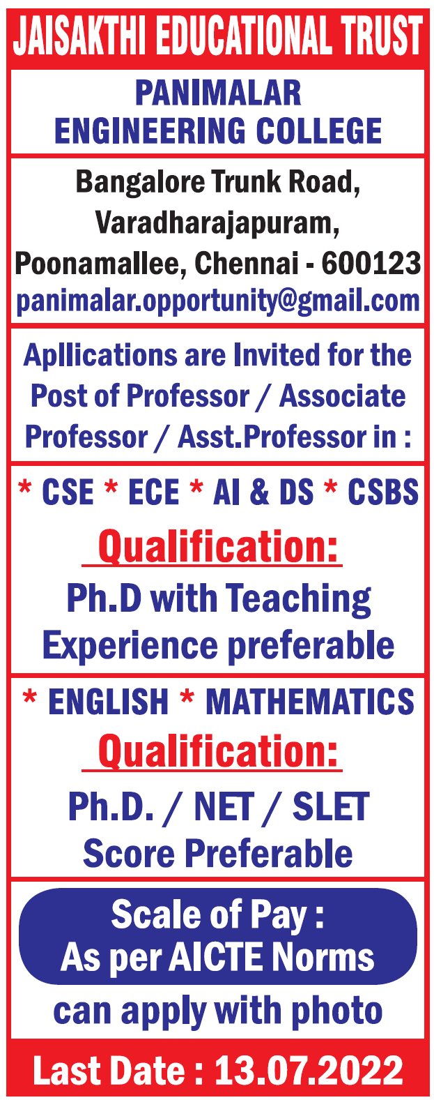 Faculty Recruitment job notification announced by Panimalar Engineering College, Chennai, Tamilnadu for the post of Professor, Assistant Professor, Non-Teaching Jobs. Eligible candidates may apply by email.