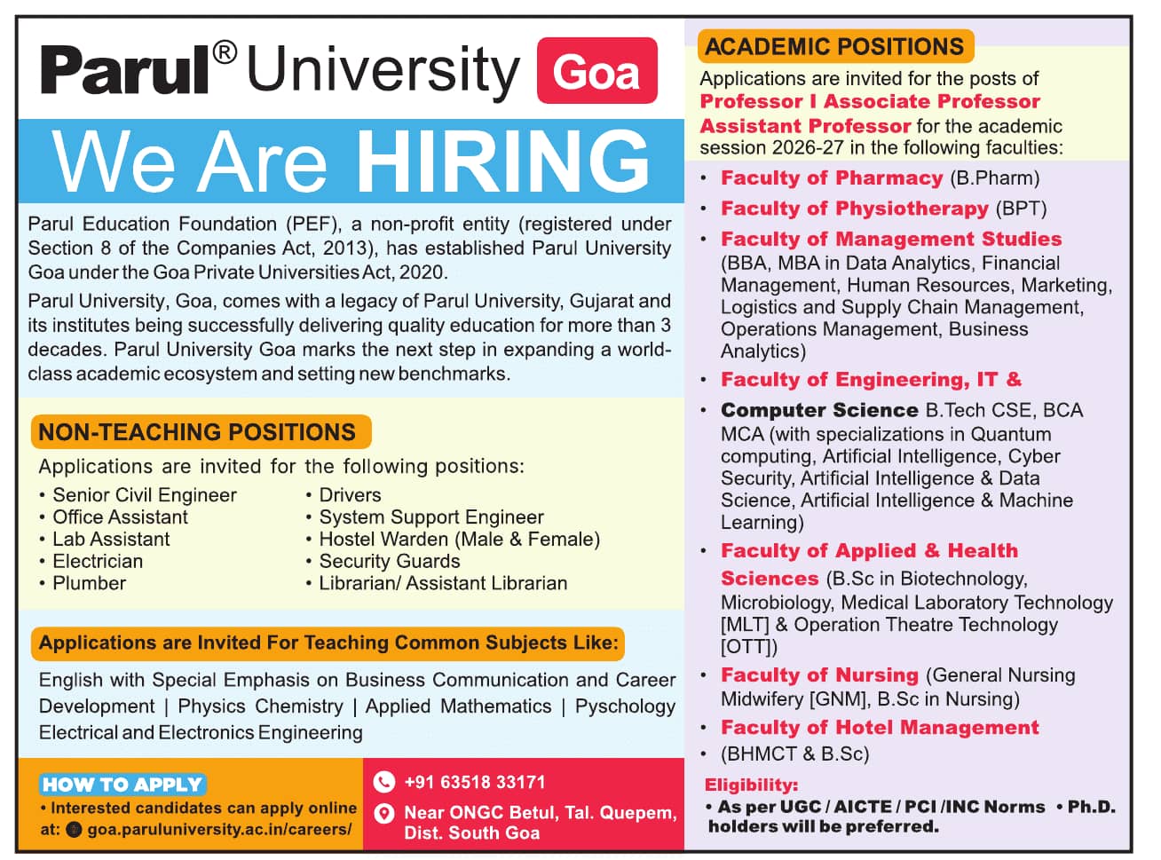 To Apply : https://goa.paruluniversity.ac.in/careers