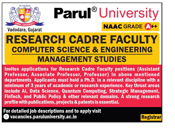 Faculty Recruitment 2025 job notification announced Parul University, Vadodara for the post of Research Cadre Faculty . Eligible candidates may apply by Online