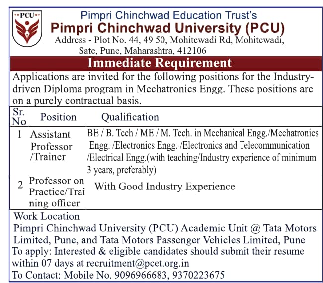Faculty recruitment notification announced by Pimpri Chinchwad University, Pune for the 2025-2026 academic calendar year for the post of Teaching Faculty . Eligible candidates may apply through email.