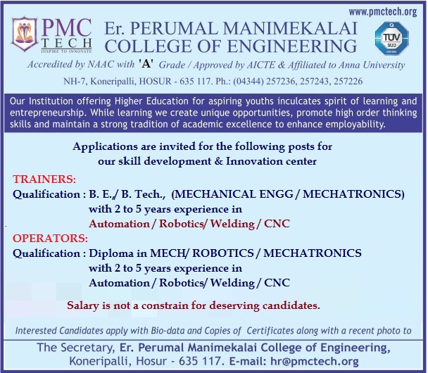 Trainers and Operators Recruitment 2021 Job vacancy notification announced by PMC Tech Er. Perumal Manimekalai College of Engineering, Hosur, Tamilnadu for the 2021-2022 academic year. Eligible candidates may apply.