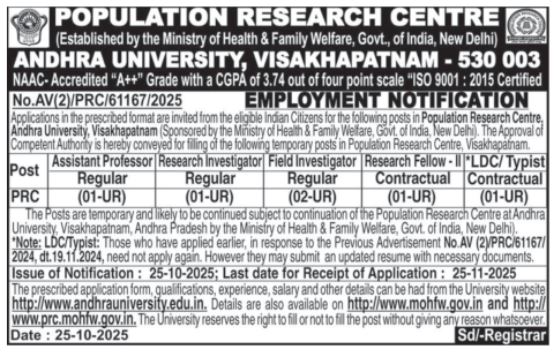 Population Research Centre, Andhra University Visakhapatnam is inviting applications for Teaching and Non-Teaching Faculty for 2025-2026 academic year. Interested candidates may apply through Postal