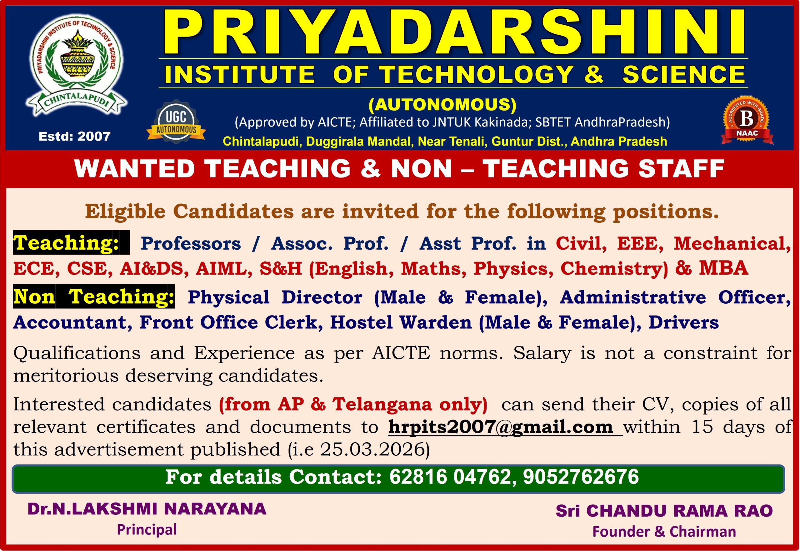 Priyadarshini Group of Institutions established by Sri Chandu Rama Rao garu in the year 2003 under Indira Education society. Priyadarshini currently consists four Engineering colleges, One Pharmacy College, One PG college in Tenali, Guntur & Hyderabad. Priyadarshini offers Diploma, B.Tech., M.Tech, MBA, B.Pharm, M.Pharm, Pharm.D, B.Sc & B.Com courses.