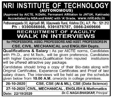 Professor/Assistant Professor/Associate Professor Jobs in NRI Institute of Technology, Guntur