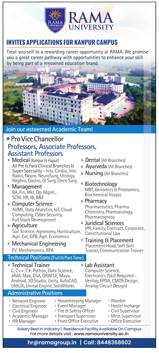 Faculty Recruitment 2024 notification announced by the Rama University, Kanpur, Uttar Pradesh – Professors/ Associate Professors/ Assistant Professors Jobs. Eligible candidates may apply through email