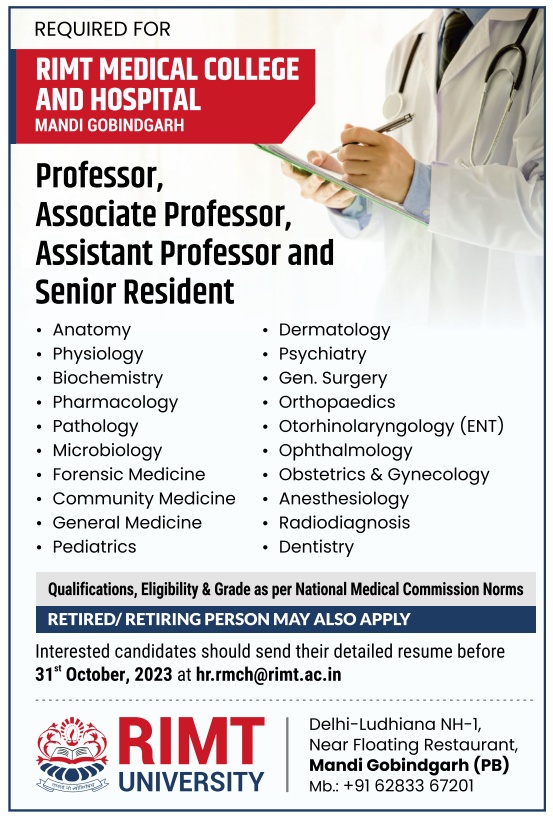 Faculty recruitment 2023 Job vacancy notification announced by RIMT Medical College and Hospital, Mandi Gobindgarh – Professor/ Associate Professor/ Assistant Professor and Senior Resident Jobs for the 2023 academic year. Eligible candidates may apply by email by 31st October 2023.