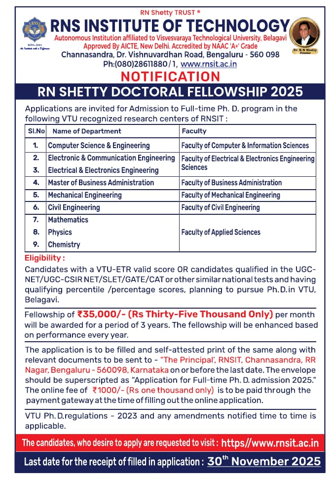 Faculty recruitment 2025 Job vacancy notification announced by RNS Institute of Technology, Bengaluru – RN Shetty Doctoral Fellowship for the 2025-2026 academic year. Eligible candidates may apply through Postal .