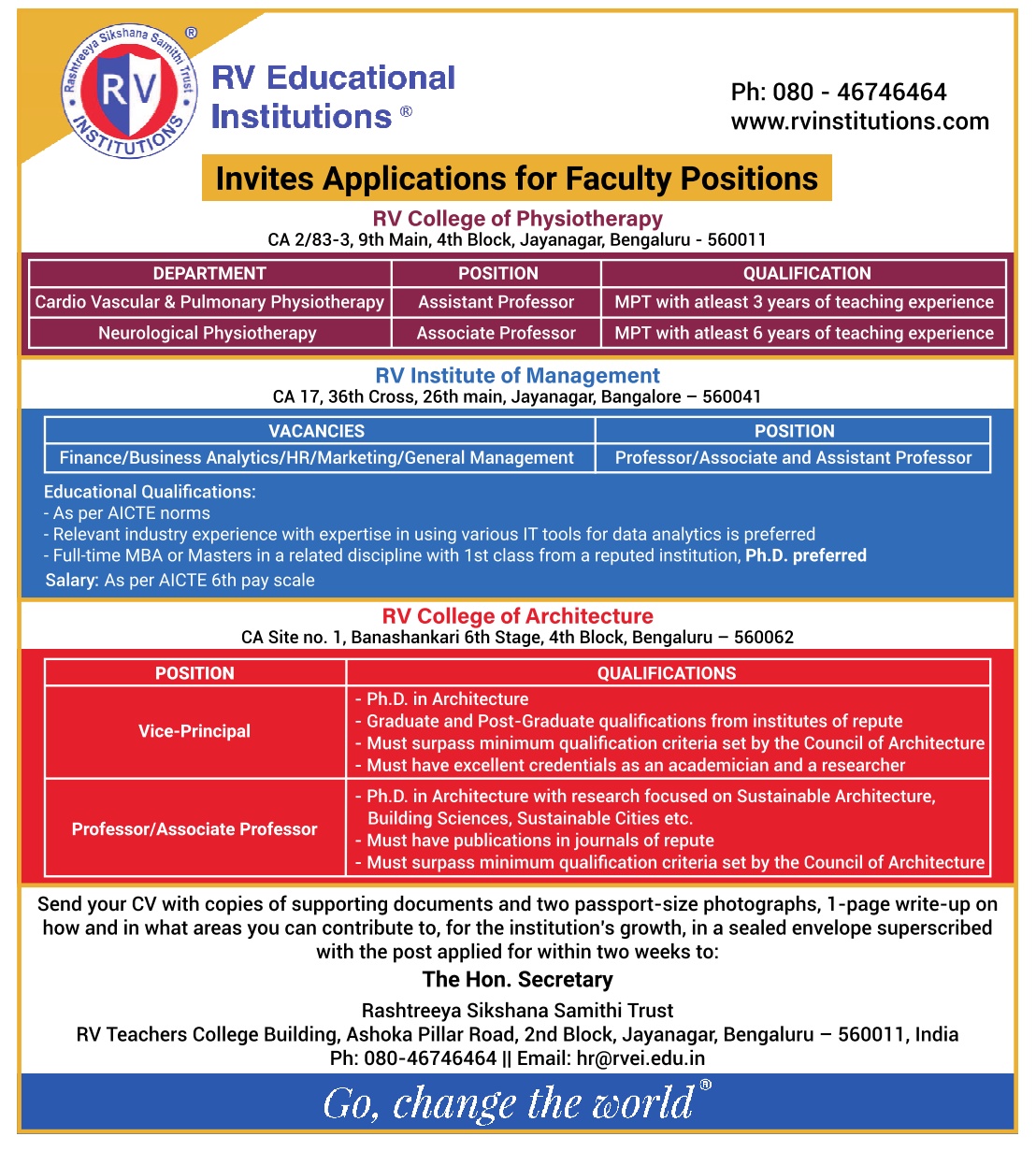 Faculty recruitment notification announced by RV Educational Institutions, Bengaluru for the 2022-2023 academic calendar year for the post of Vice-Principal, Professor/ Associate Professor/ Assistant Professor. Eligible candidates may apply through post.