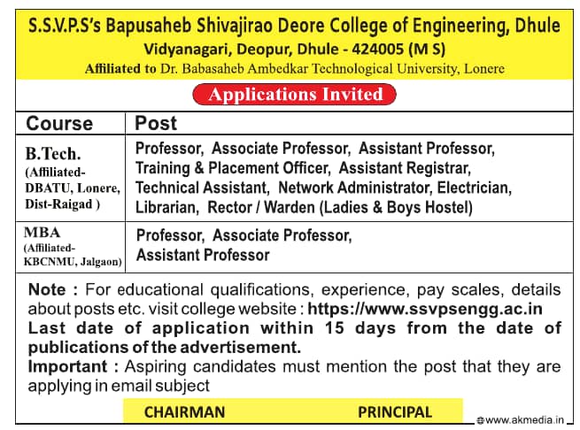 Hiring Organization: S.S.V.P.S’s Bapusaheb Shivajirao Deore College of Engineering Dhule